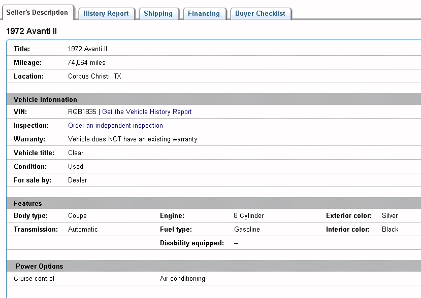 Bob's Studebaker Resource Website 1972 Avanti II RQB-1835 Listing Jan 2009