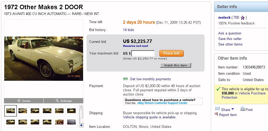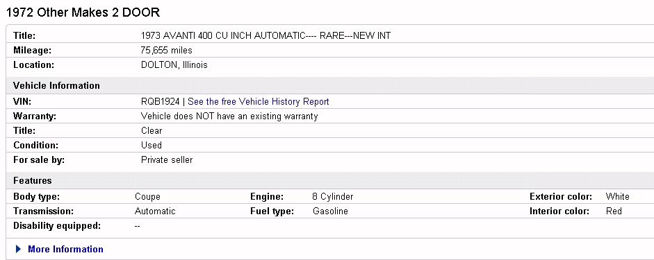Bob's Studebaker Resource Website 1973 Avanti II - RQB1924 Listing - December 2009