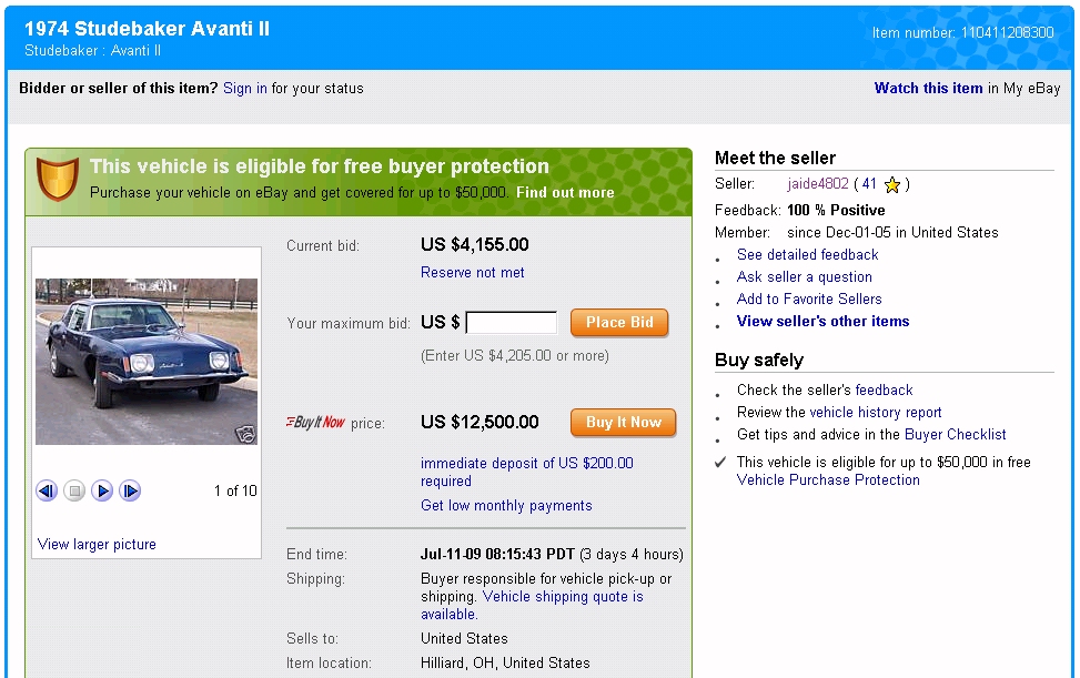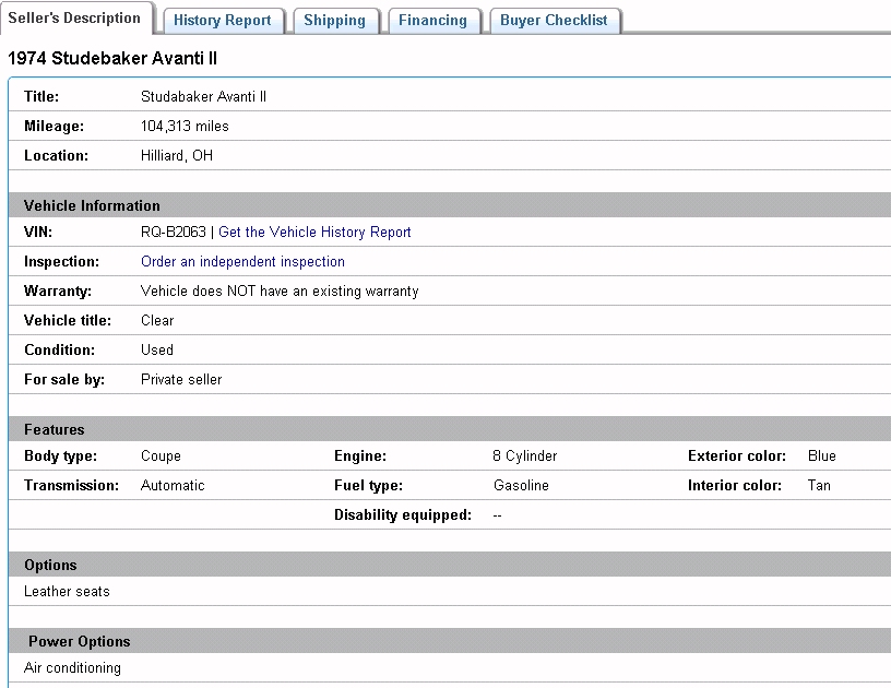 Bob's Studebaker Resource Website 1974 Avanti RQB-2063 - July 2009 Listing