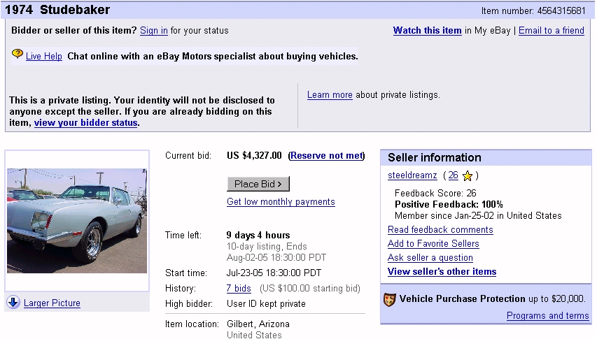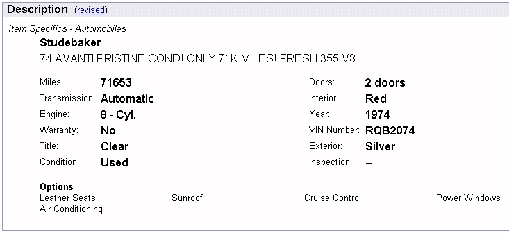 Bob's Studebaker Resource Website Avanti II RQB-2074 Ebay Description