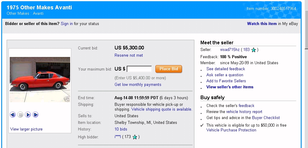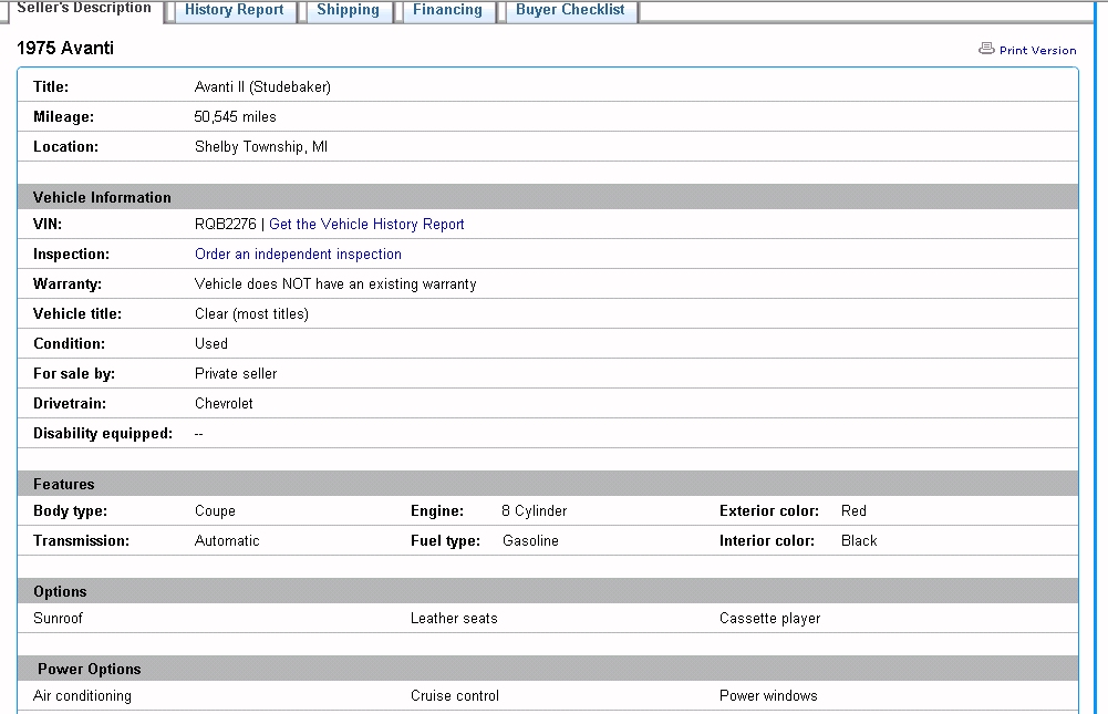 Bob's Studebaker Resource Website 1975 Avanti RQB-2276 Ebay Listing