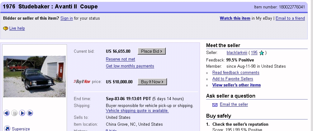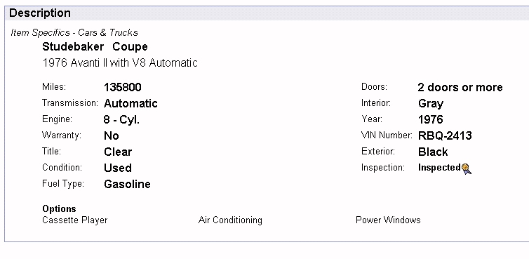 Bob's Studebaker Resource Website 1976 Avanti II RQB-2413 Ebay listing
