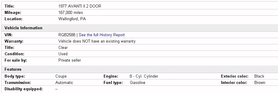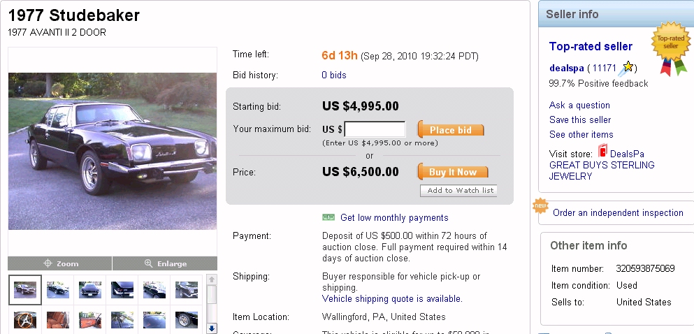 Bob's Studebaker Resource Website 1977 Avanti RQB-2588 Ebay Listing - Sep 2010