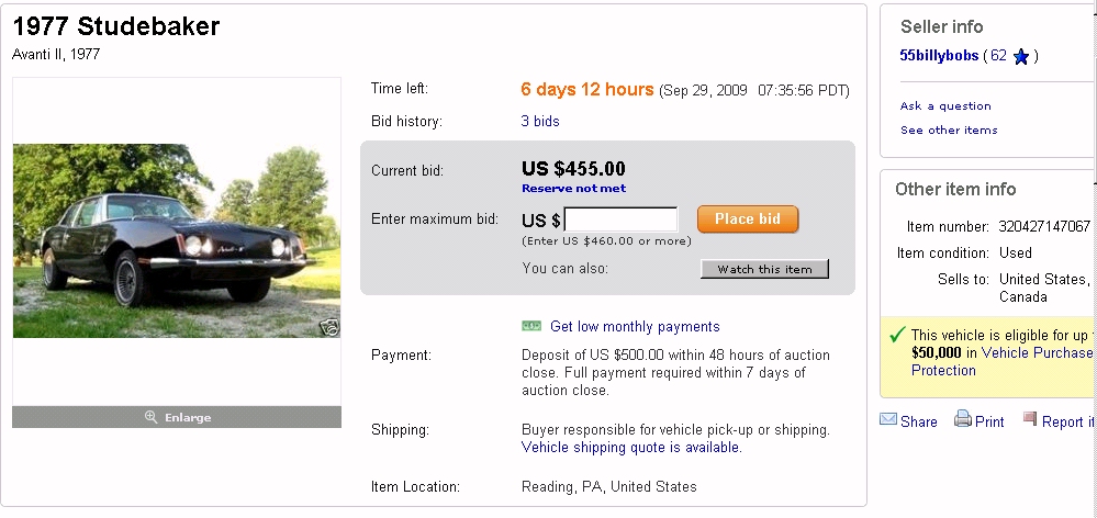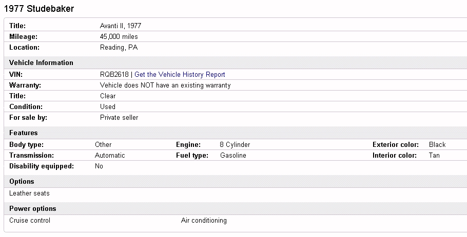 Bob's Studebaker Resource Website 1977 Avanti II RQB-2618 Listing - Sept 2009