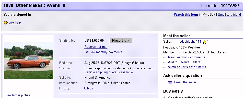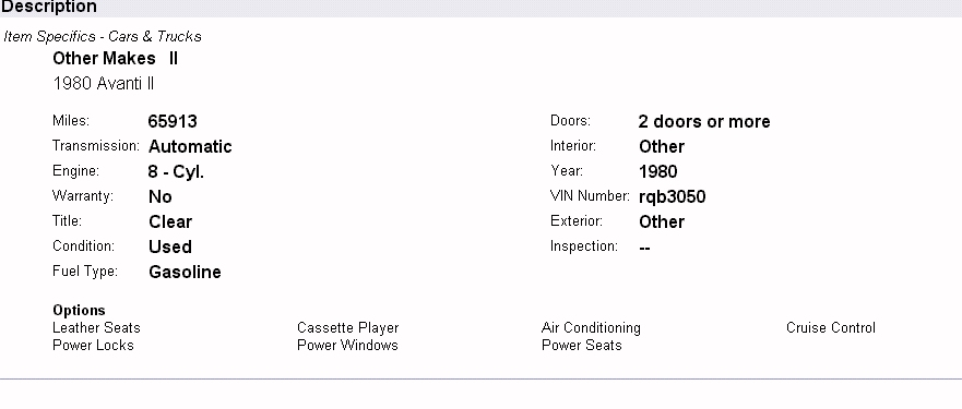 Bob's Studebaker Resource Website 1981 Avanti II RQB-3050 Ebay Listing