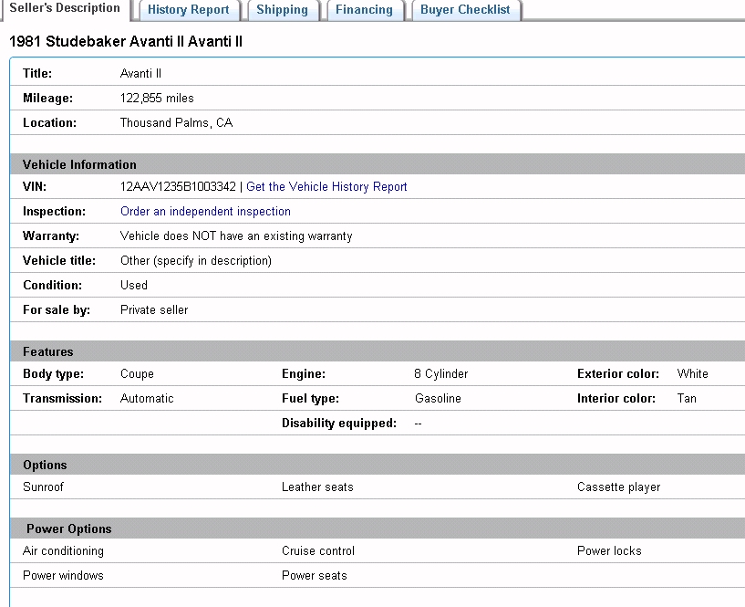 Bob's Studebaker Resource Website 1981 Avanti II RQB-3342 - February 2009 Listing - Feb 2009