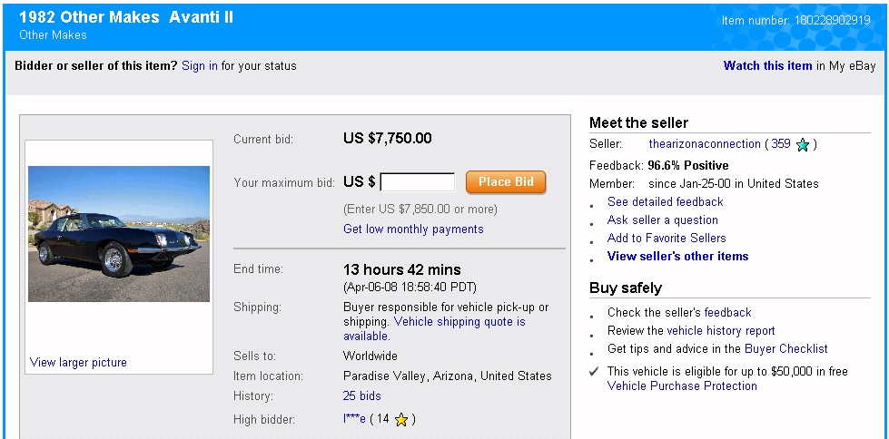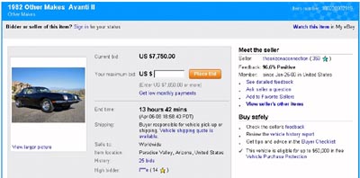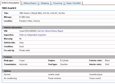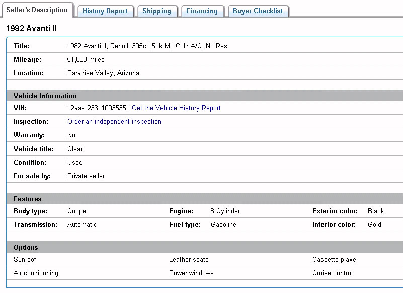Bob's Studebaker Resource Website 1982 Avanti II RQB-3535 April 2008 Ebay Listing - April 2008