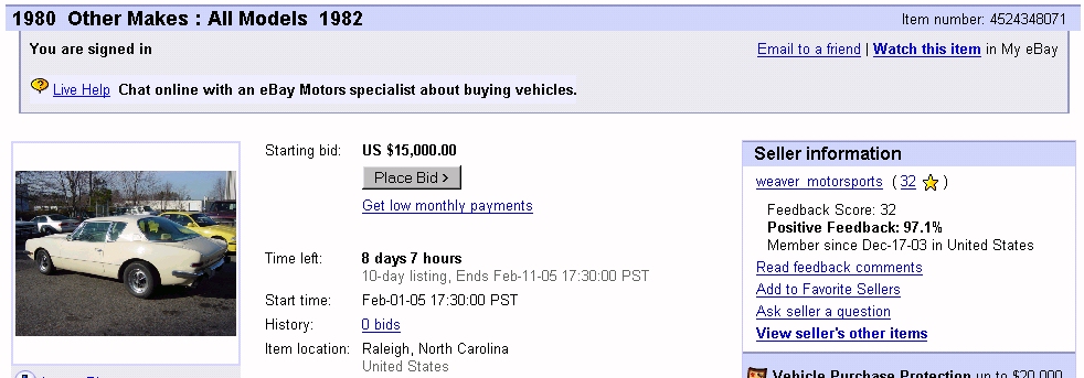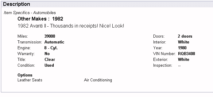 Bob's Studebaker Resource Website 1982 Avanti II RQB-3408 Ebay Listing February 2005