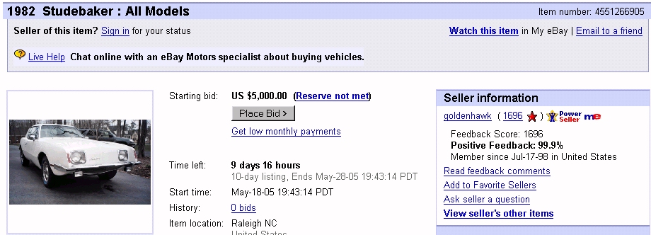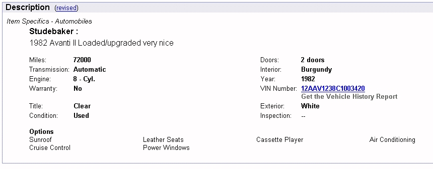 Bob's Studebaker Resource Website 1981 Avanti II RQB-3420 Ebay Listing