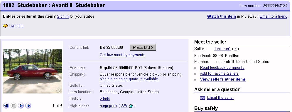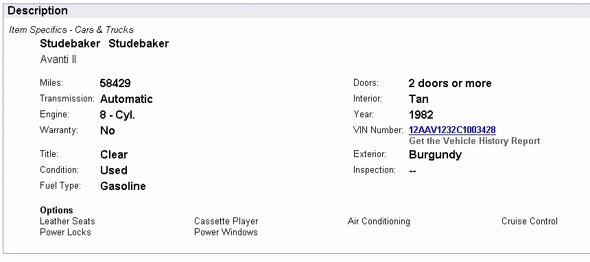 Bob's Studebaker Resource Website 1982 Avanti II RQB-3428 September 2006 Ebay Listing