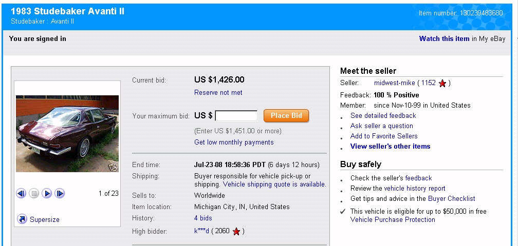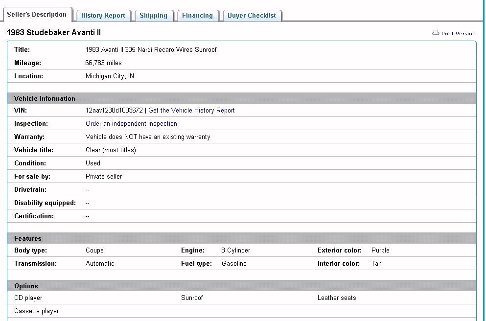 Bob's Studebaker Resource Website 1983 Avanti RQB-3672 Ebay Listing