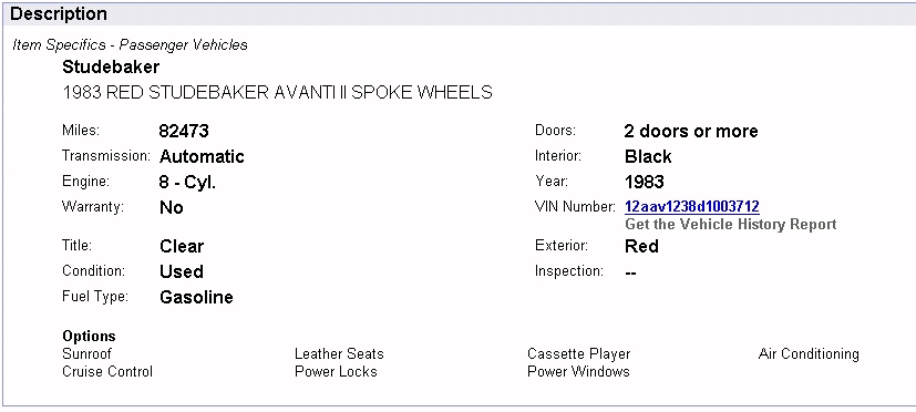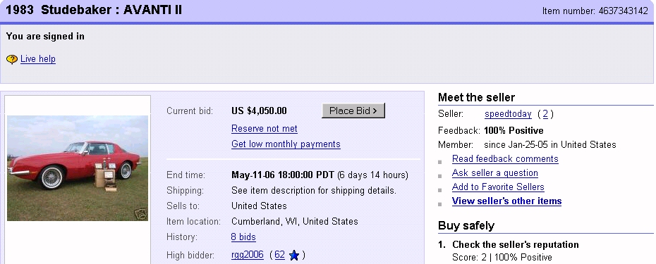 Bob's Studebaker Resource Website 1983 Avanti II RQB-3712 - May 2006 Ebay Listing