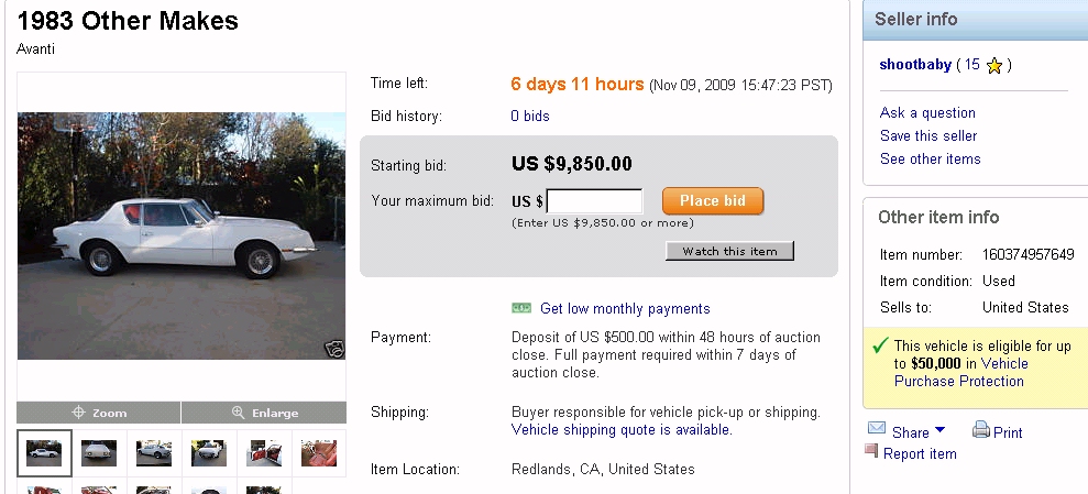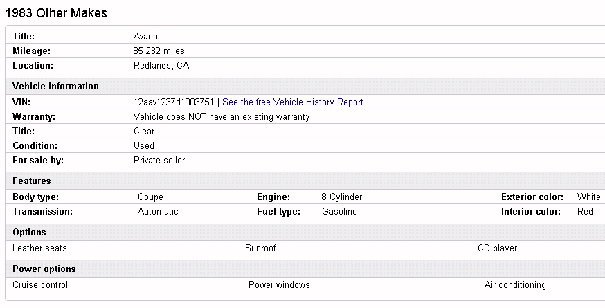 Bob's Studebaker Resource Website 1983 Avanti RQB-3751 - Nov 2009 Listing