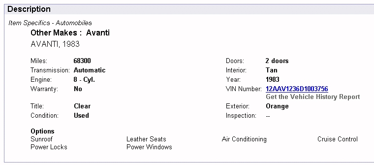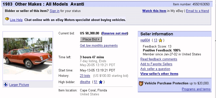 Bob's Studebaker Resource Website 1983 Avanti II RQB-3756 - May 2005 Ebay Descripton