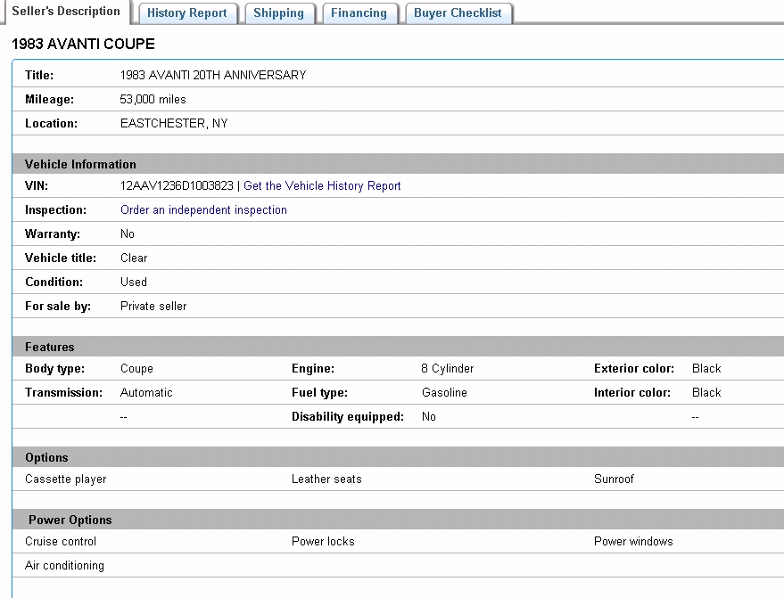 Bob's Studebaker Resource Website 1983 Avanti RQB-3823 Listing
