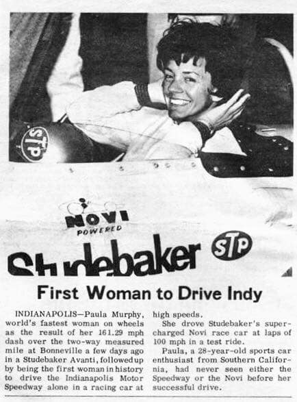 Paula Murphy came to Indianapolis in 1963 well equipped and experienced, especially at being a pioneer. She had raced sports cars for almost a decade and had set hundreds of women’s records in a variety of motoring feats. And at a time when women weren’t even allowed in the pits at the famed Indianapolis Motor Speedway, she became the first woman to drive an Indy-style race car there, thanks to her lifelong friendship with STP’s Andy Granatelli, in whose Novi race car she lapped the fabled Brickyard oval. Speed clearly was not an issue either, as she had driven Walt Arfons’ Avenger jet dragster to a female land-speed record of 226.37 mph at Bonneville. - Tom Renk - Mar 2019 |