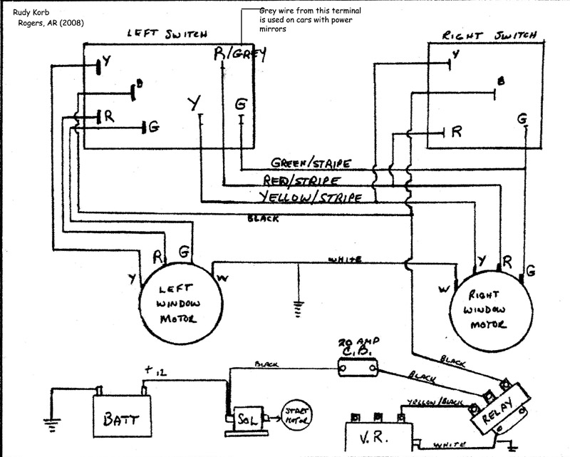 OPERATION: Power is supplied from the HOT side of the STARTER SOLENOID to the 20 Amp CIRCUIT BREAKER to the RELAY (+12 in). When you turn the IGNITION key to the ACC position, power is supplied to the VOLTAGE REGULATOR, which energizes the post with the YELLOW Wire. This, in turn, trips the RELAY and supplies POWER to the Window Circuit.