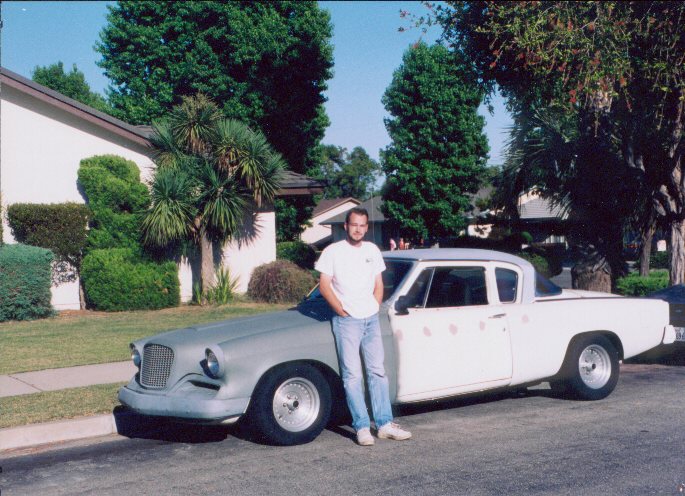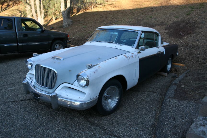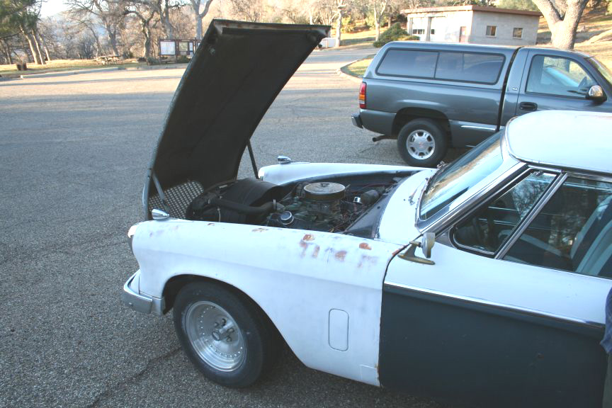 Currently, a built 289 Stude engine, Corvette 700-R4 w/Steeltech adapter, Steeltech front disc brakes, and a Steeltech HEI distributor. It has factory power windows, and unfortunately a wiring nightmare. The car was saved from the frontyard of a house in downtown Santa Barbara. Right away it needed a front clip. It also needed rear springs. Two sets from Newman & Altman were sent back after they couldnt support the weight of the rear of the car! Since only one spring was bent, I pulled them both apart, and alternated the springs - then added a helper 1.5 inch offroad lift spring. It runs the entire length of the main leaf. That brought the back end up.